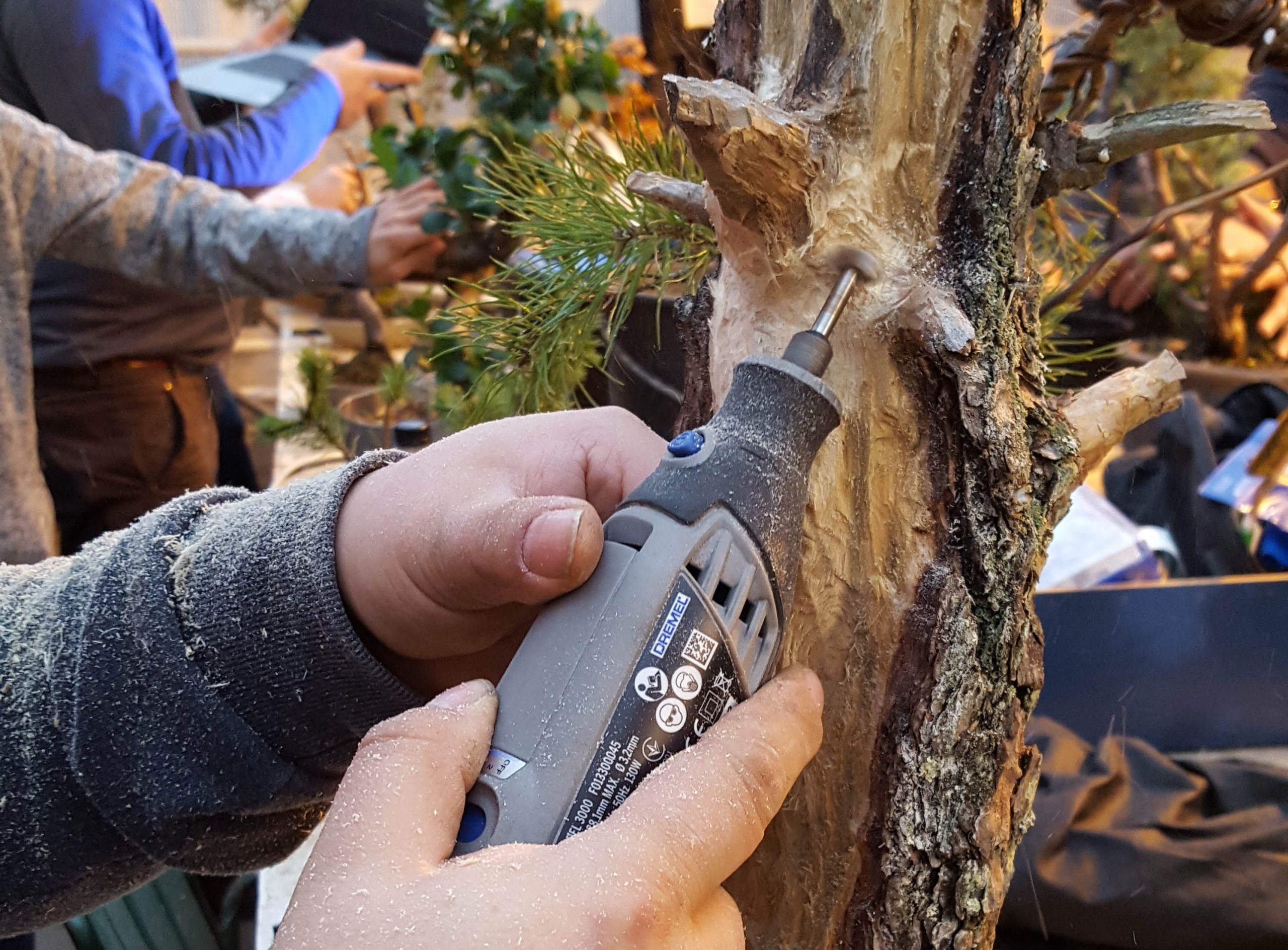Dagens andra tema är ”Jin/Shari” vilket handlar om att forma och färga döda partier på grenar (jin) och stammar (shari). Det finns mycket roligt att skapa inom denna genre och vi går igenom hur de kan formas och färgas för att få bra effekt, framför allt på barrträd. Vi hoppas att alla ska känna sig trygga i att forma en jin eller shari själva efter genomgång.